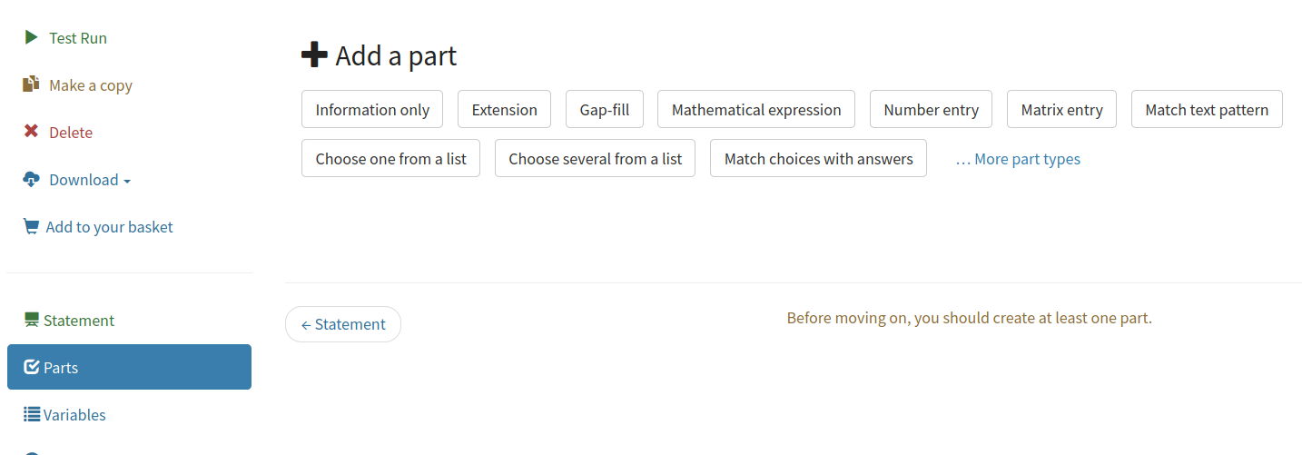 Every Numbas question consists of three sections: Statement, Parts, and Advice. In the Statement, the context for the question is given to the student. Parts are where the student enters their answers: the student is shown some prompt text, and then a field to enter their response to the prompt. A question can have one or more parts, each of which is one of several types, depending on what kind of input you want from the student. Finally, the optional Advice section can be used to give a full solution to the question, which the student can request to see if they’re stuck.